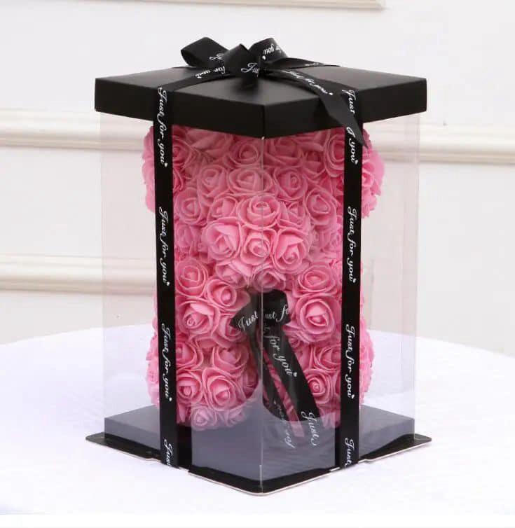 Oso de rosas fomi Alto 24 cm Largo 15cm Ancho 15 Desarmado incluye la caja transparente liston negro
